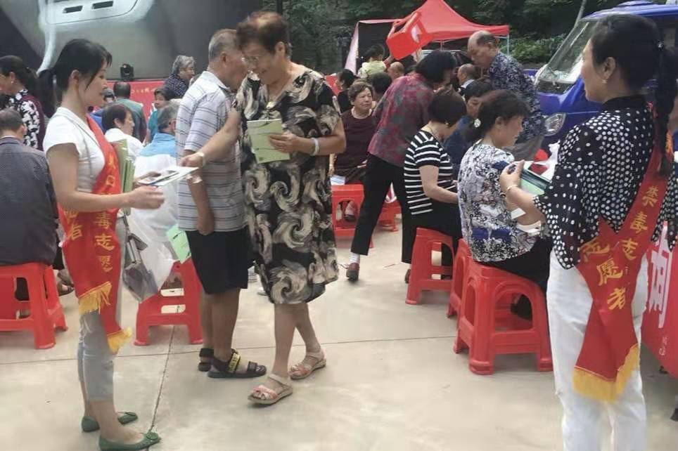 演出活動中,襄沙化工廠和社區(qū)工作人員向觀眾發(fā)放創(chuàng)城和禁毒宣傳資料。